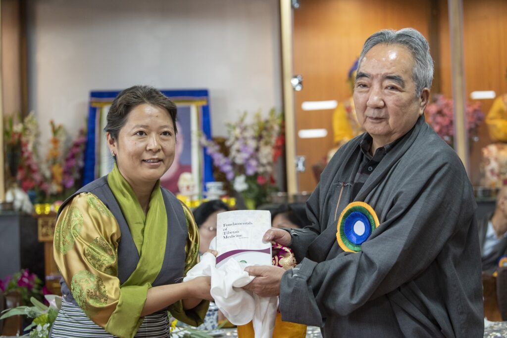 特邀嘉宾洛桑金巴先生在典礼上发布了门孜康藏医药研究科出版发行的《藏医学基础理论》和门孜康临床研究科出版发行的《微生物学基础知识》两本新书;其次他还对在门孜康从事服务工作长达30年和20年的员工颁发荣誉证书和进行表彰,特别对叶西侃卓医师在门孜康工作长达 40 年进行了最高表彰和颁发荣誉证书;随后藏医历算学院的大学生们进行了文化娱乐表演。
